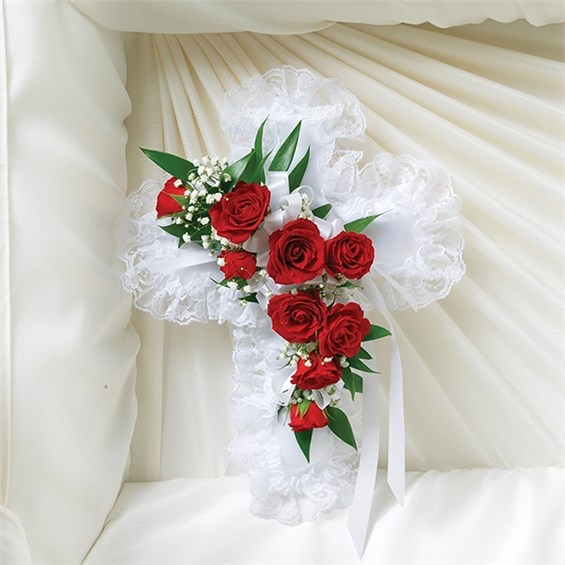 A tasteful memento of faith and love for the dearly departed to take with them. Our satin cross casket pillow, fashioned by our expert florists with a spray of radiant red spray roses and white ribbon, is a simple yet elegant arrangement and a touching ornamental gesture.