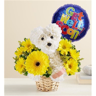 Our truly original flower pup is the best pick-me-up for anyone under the weather. Handcrafted with white blooms and yellow accents, this adorable creation will have them on the mend in no time. Add a colorful Get Well balloon for happy healing wishes. One-sided 3D arrangement with white carnations, yellow Gerbera daisy and daisy poms and solidago; accented with assorted greenery Crafted in the shape of a dog, complete with eyes, nose and Band-Aid on his paw Arrangement measures approximately 11"H x 11"H Our florists select the freshest flowers available, so colors, varieties and container may vary due to local availability 18"D Mylar “Get Well” balloon; design may vary due to local availability Baskets may Vary
